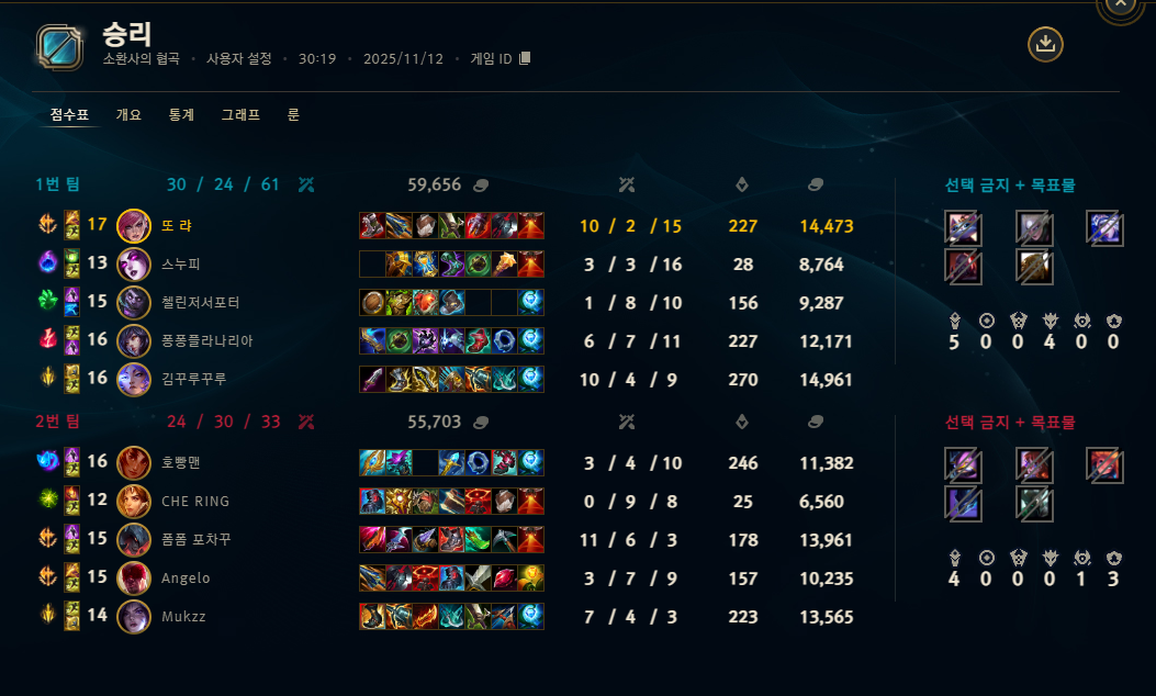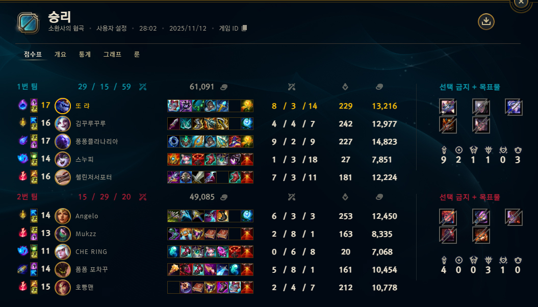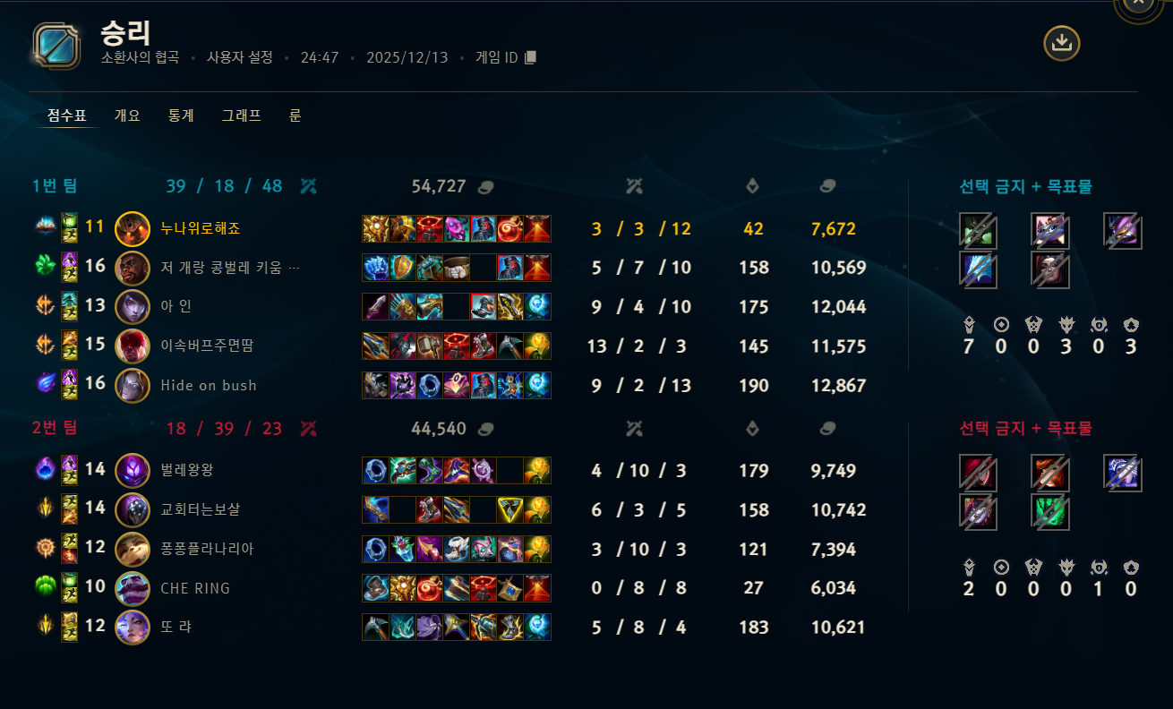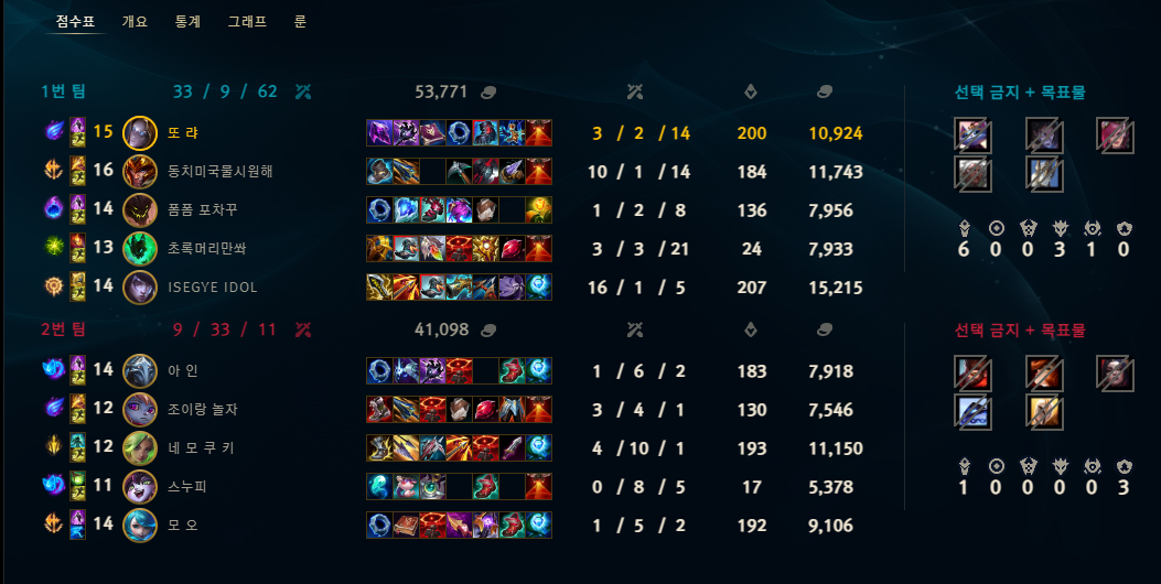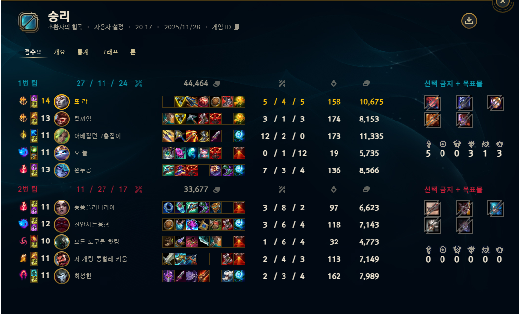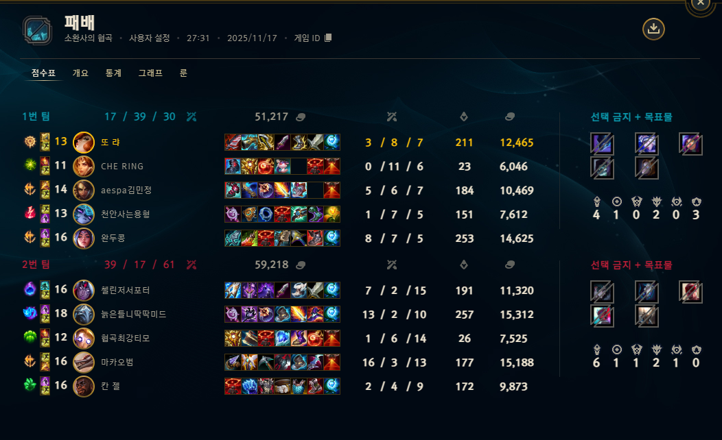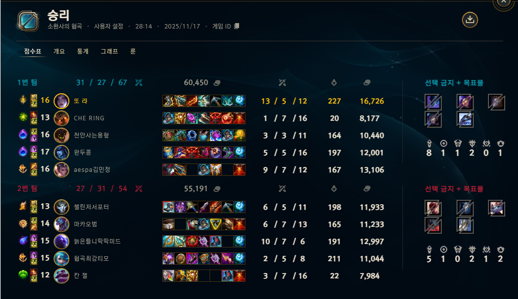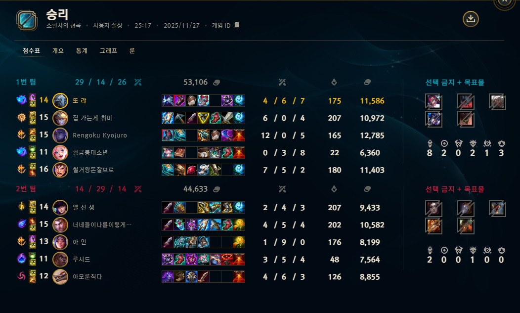| 챔피언 | 게임 수 | 승률 | K | D | A | CS |