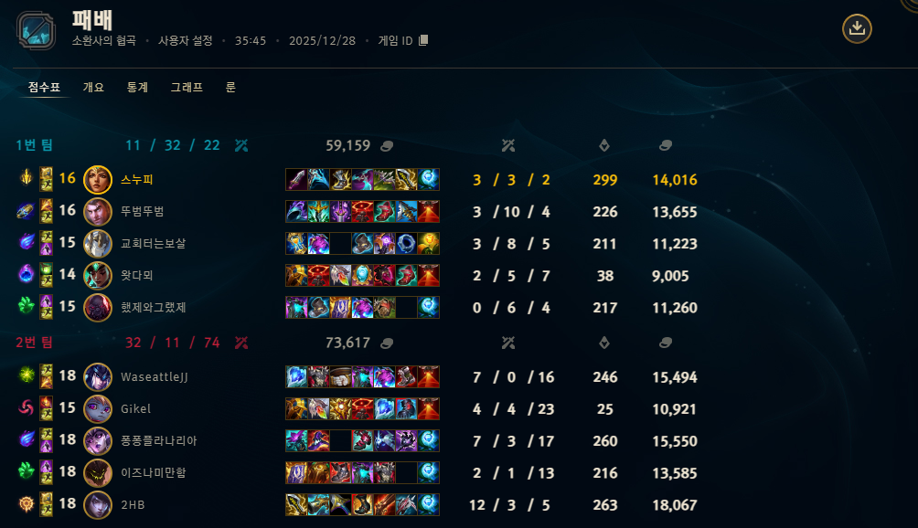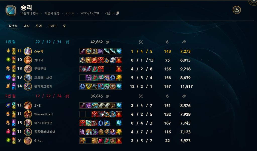 | 챔피언 | 게임 수 | 승률 | K | D | A | CS |