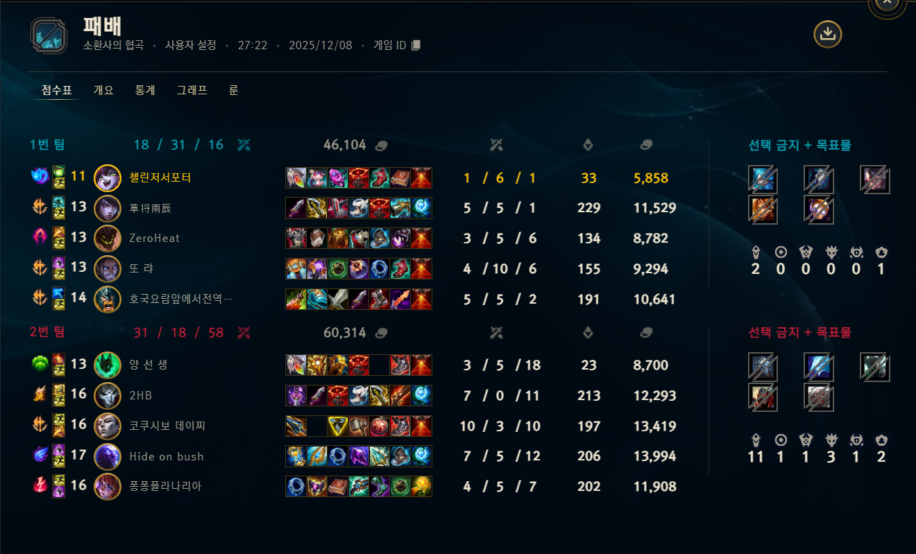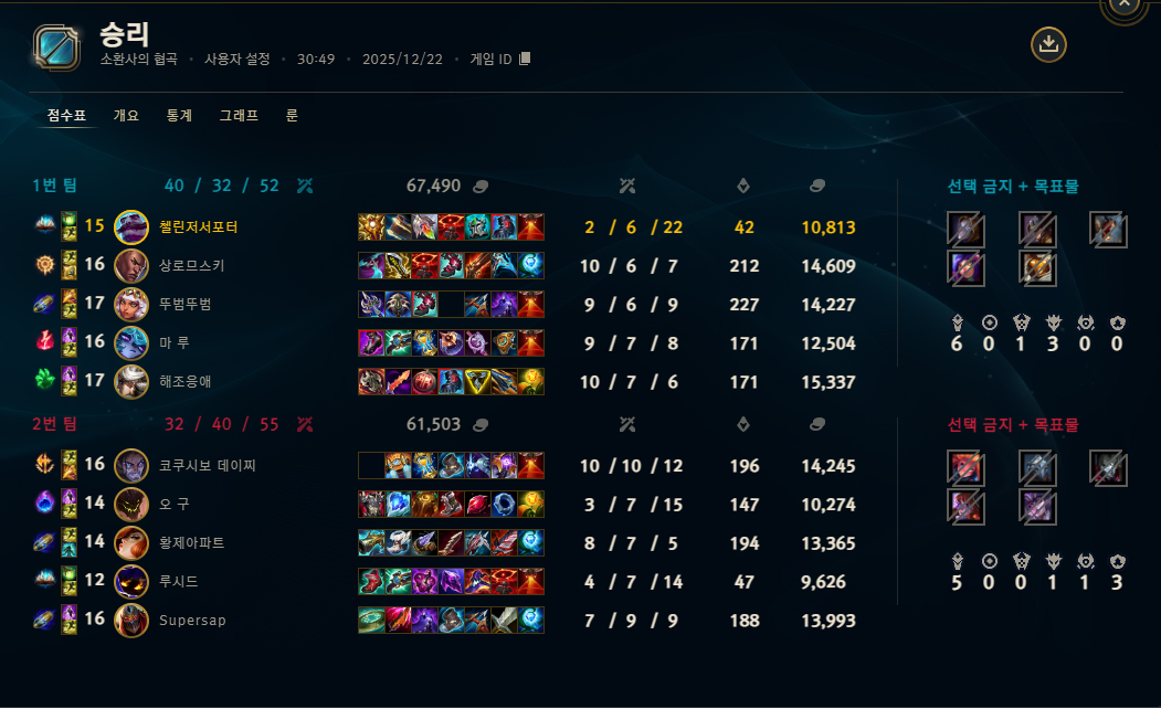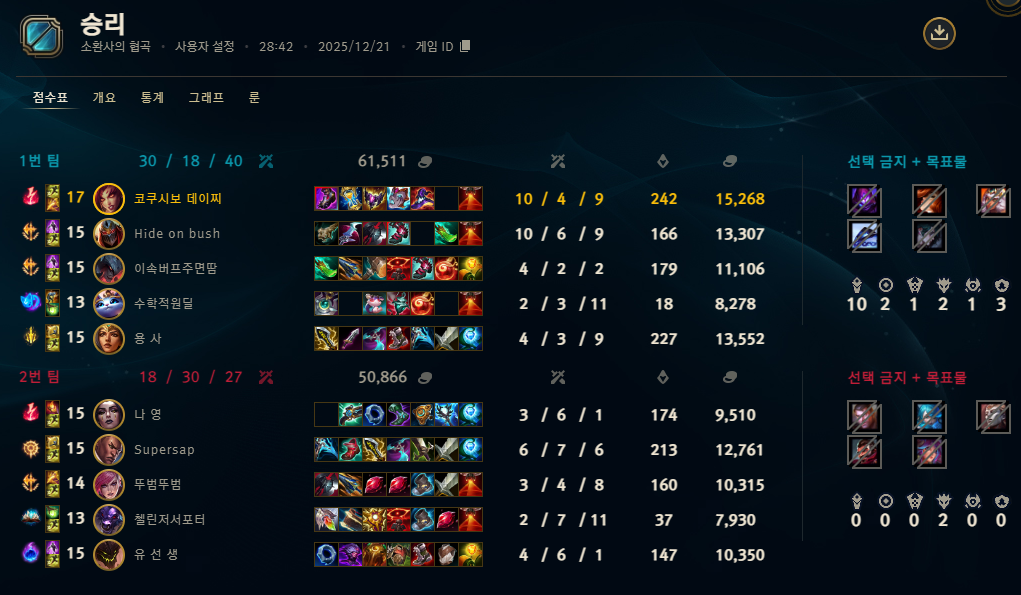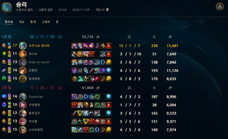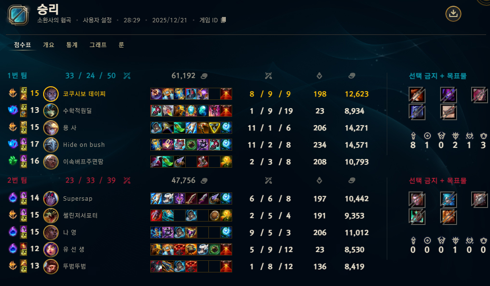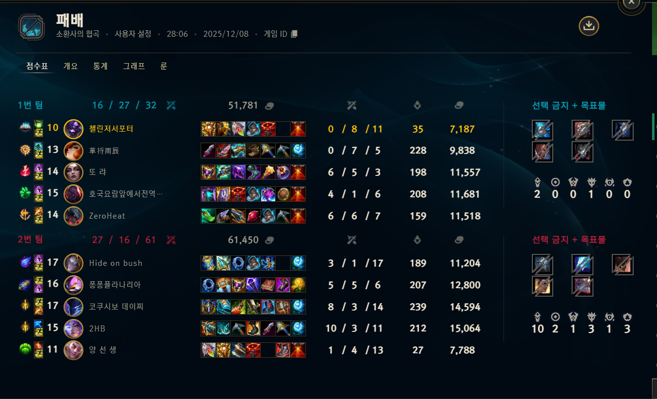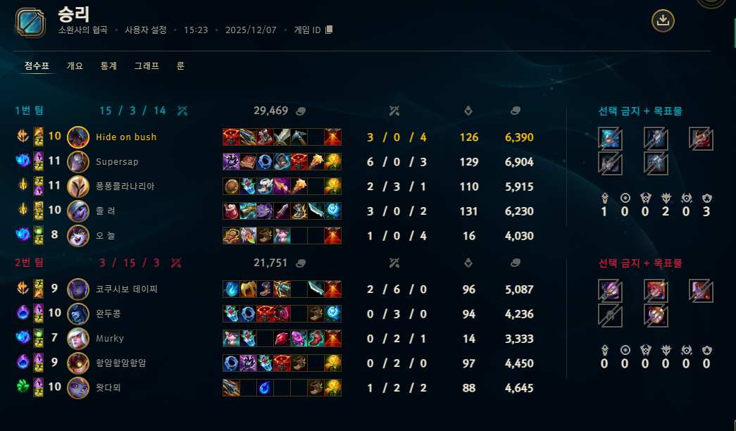 | 챔피언 | 게임 수 | 승률 | K | D | A | CS |